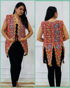 Our latest embroidered ethnic jacket for women is a tribute to this festive spirit. Inspired by the lively energy of Garba nights, it is designed with multicolor thread embroidery, mirror work, and traditional kutchi patterns that reflect the heart of Gujarat’s folk art.